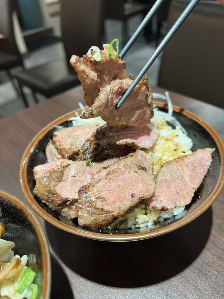 而同行友人點的是厚切牛排丼飯,少女般的粉紅牛小排,整理來說口感豐富,牛肉是軟嫩而有嚼勁,口感鮮嫩多汁,不會太柴硬。搭配洋蔥絲,為整碗牛排飯增添香甜爽脆口感!