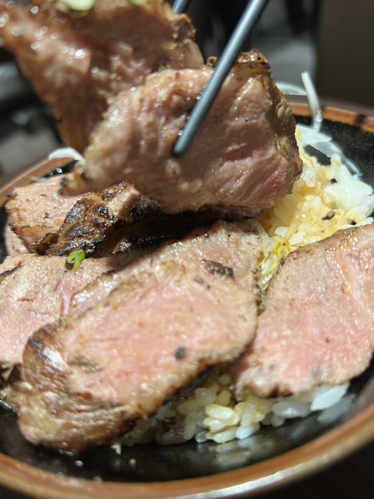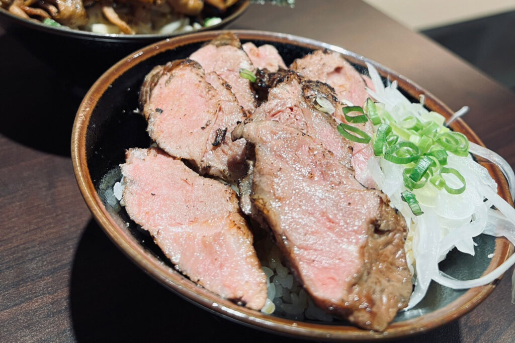 店內出餐蠻快速的,不到十分鐘厚切牛排丼飯就已準備完畢,上菜時陣陣肉香撲鼻而來~眼看著白飯上鋪滿了鮮嫩的牛排,配上清脆洋蔥和蔥花,看起來非常美味。